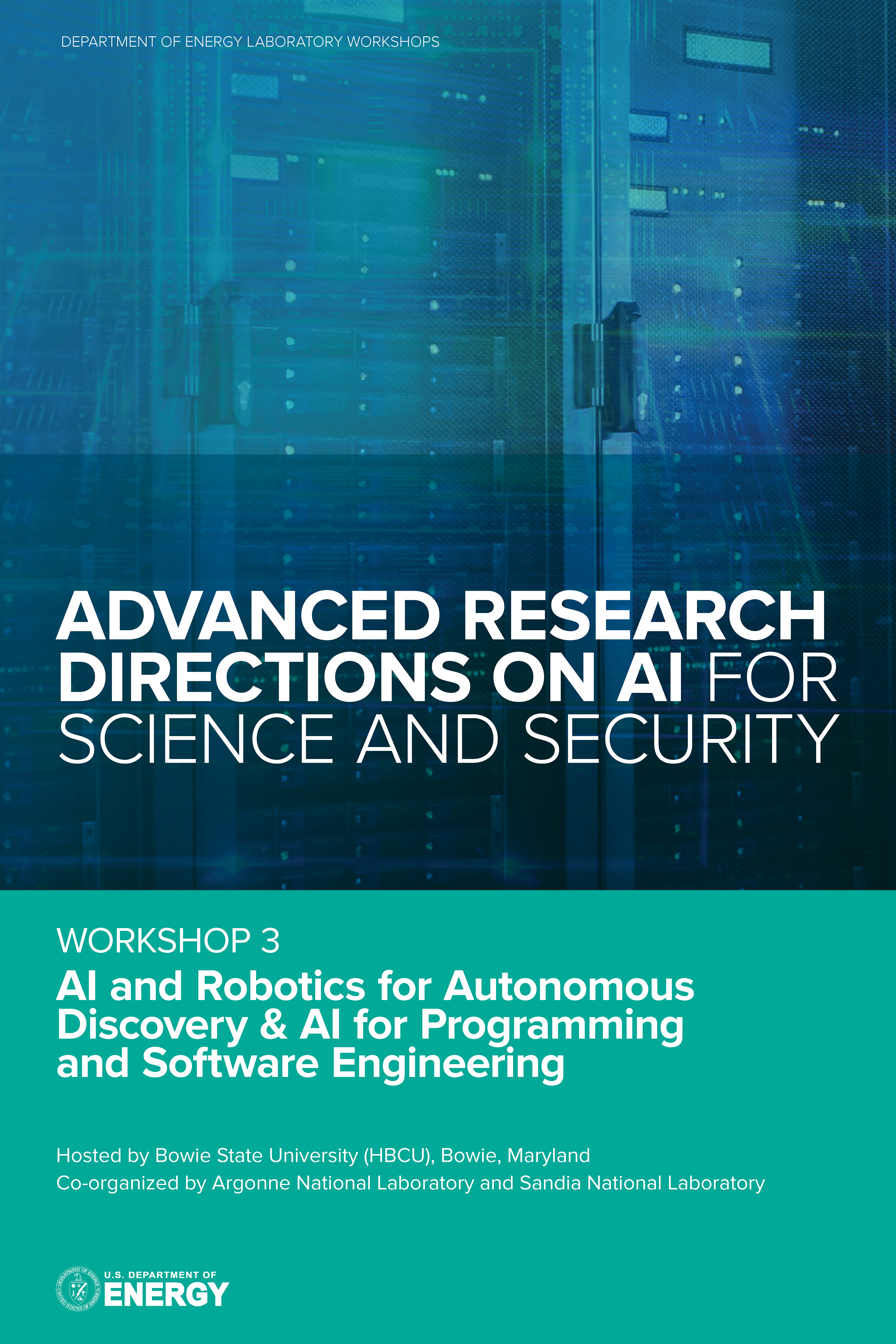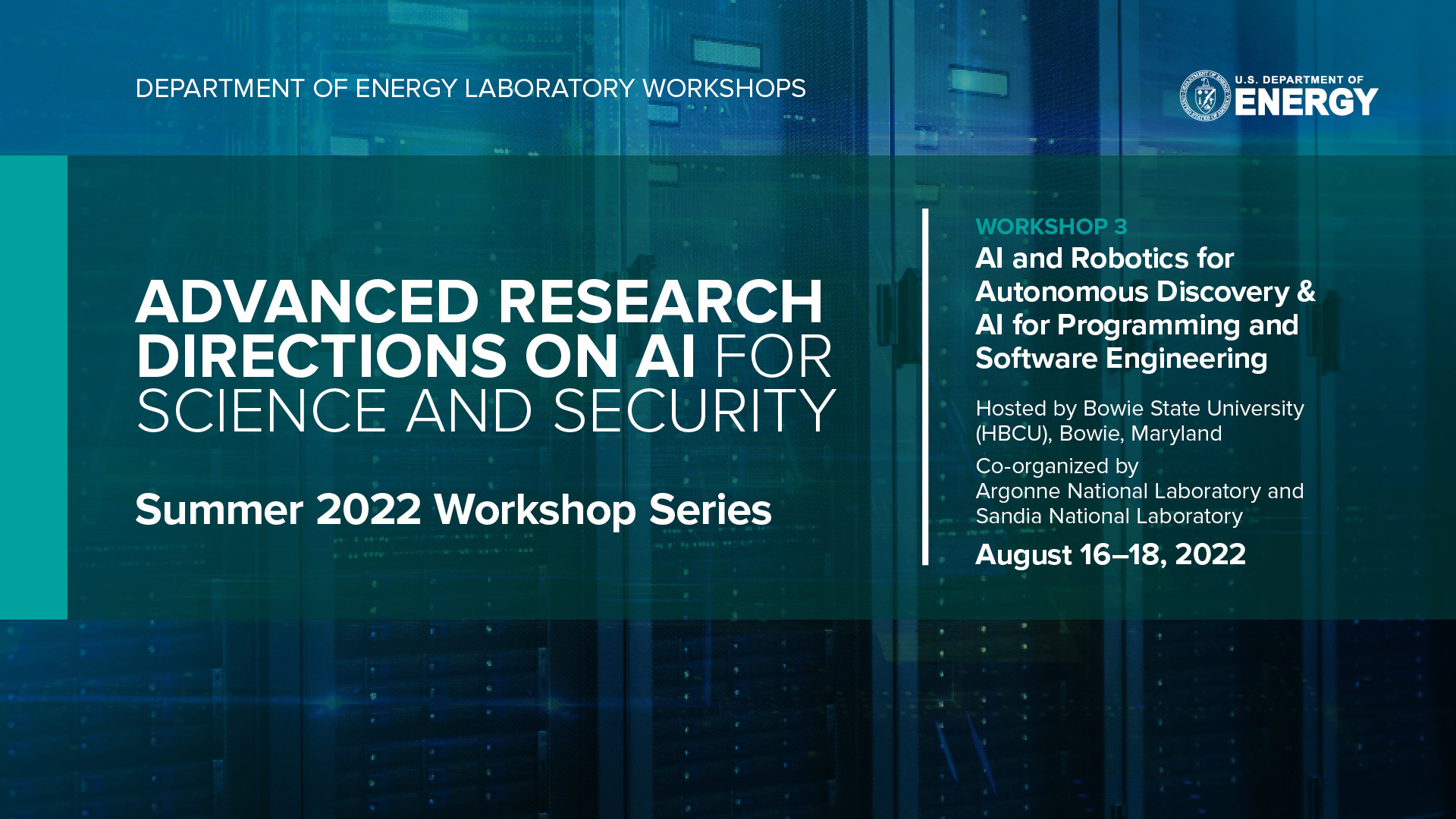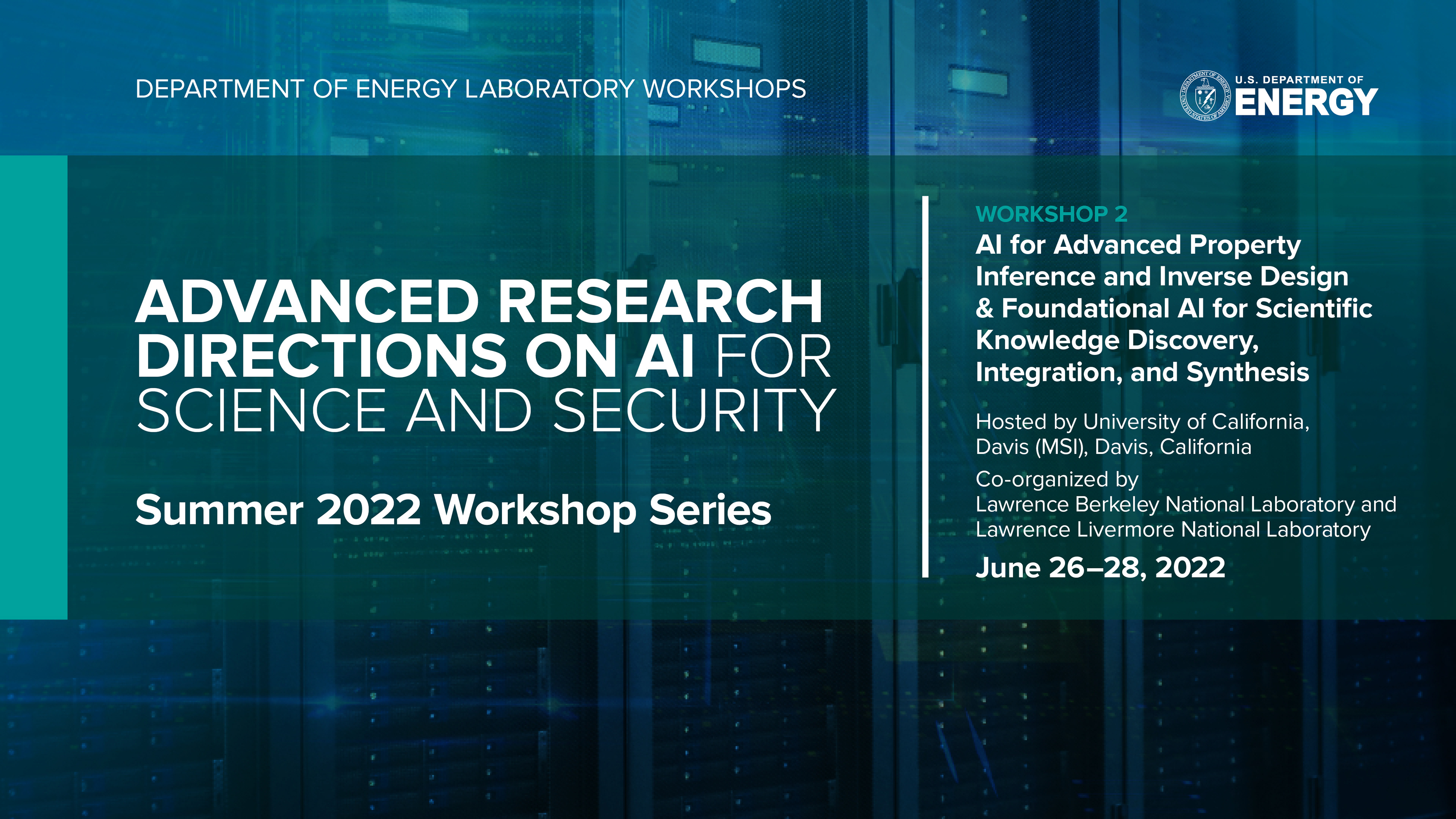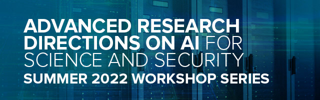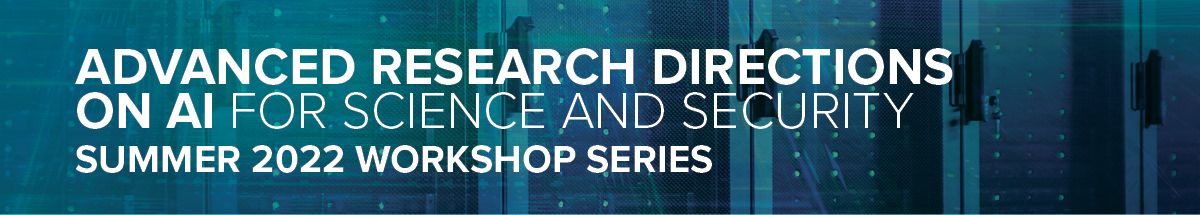 Various materials created for the Advanced Research Directions on AI for Science and Security (also called AI4Science) workshop including a signature image, a full size pull-up banner, Microsoft Word editable agenda, web banners, series of ePosters, large printed posters, and editable name tags.