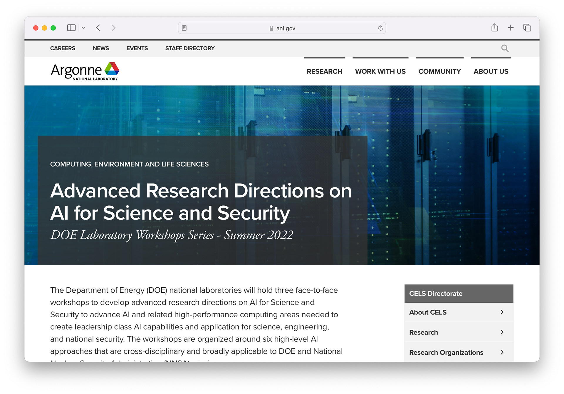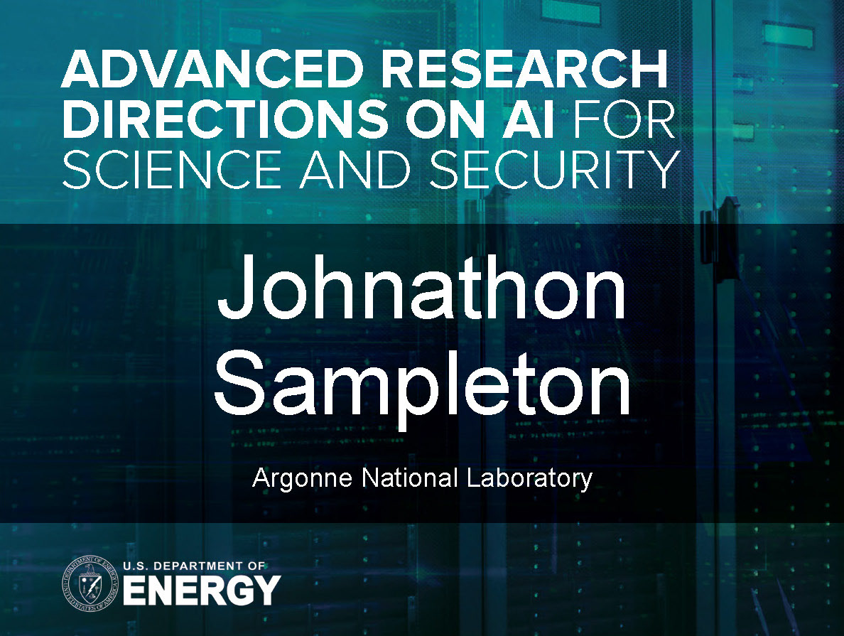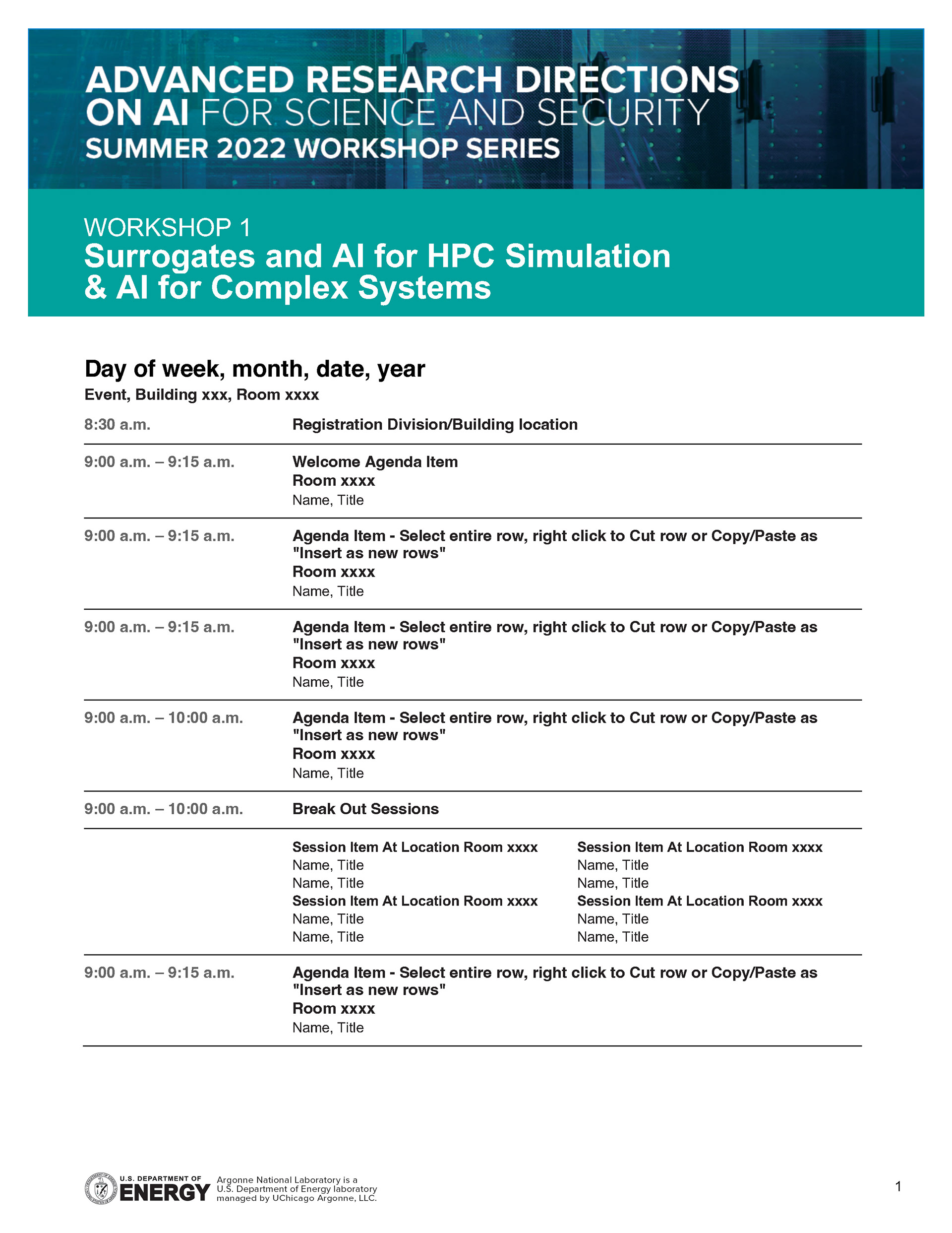 Various materials created for the Advanced Research Directions on AI for Science and Security (also called AI4Science) workshop including a signature image, a full size pull-up banner, Microsoft Word editable agenda, web banners, series of ePosters, large printed posters, and editable name tags.