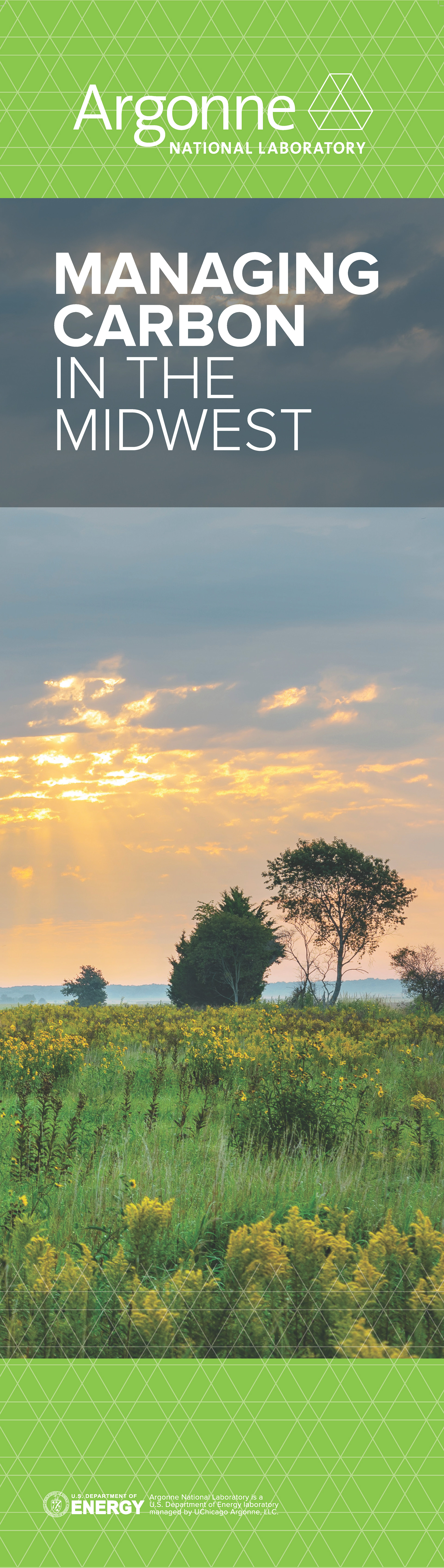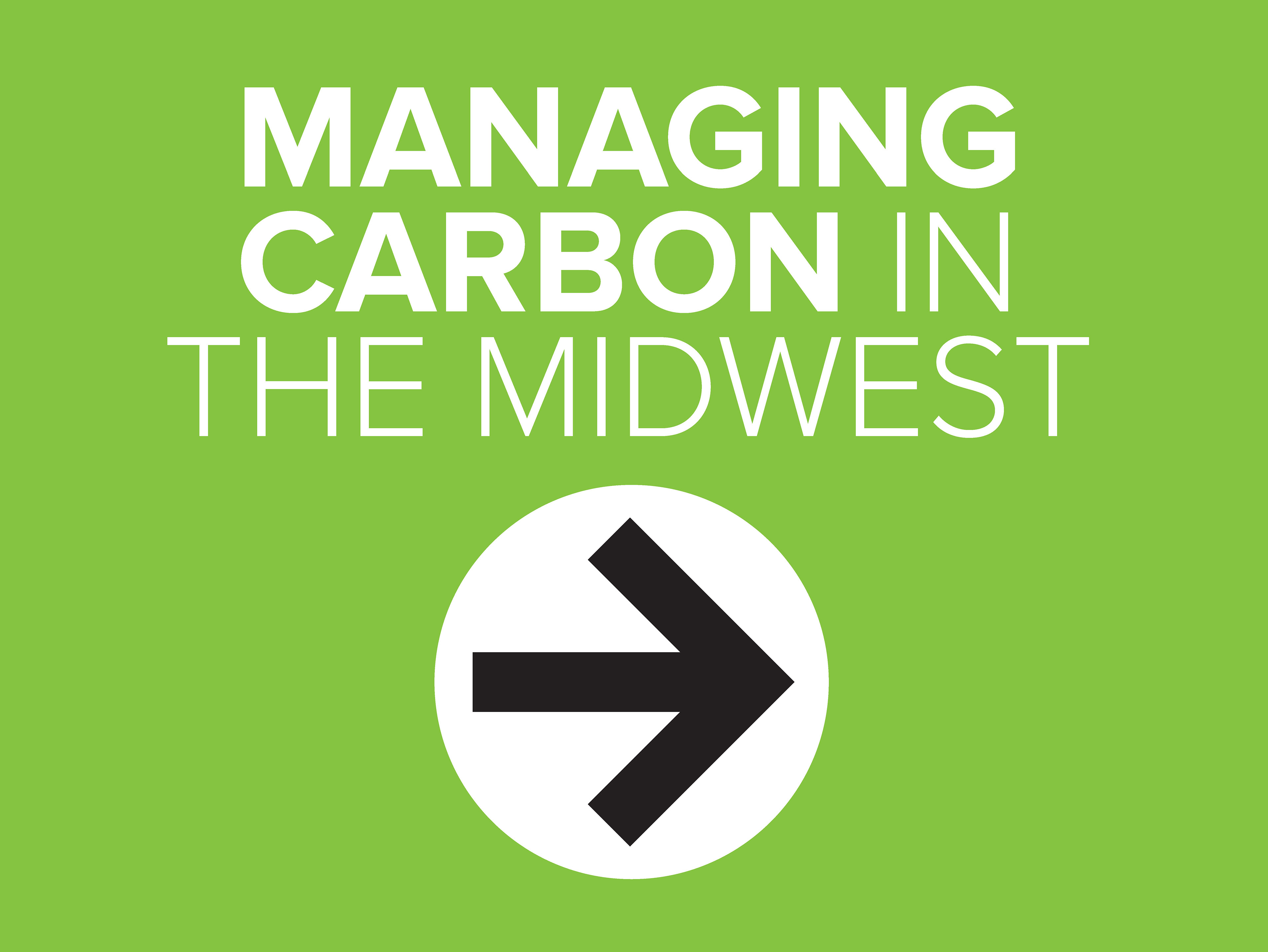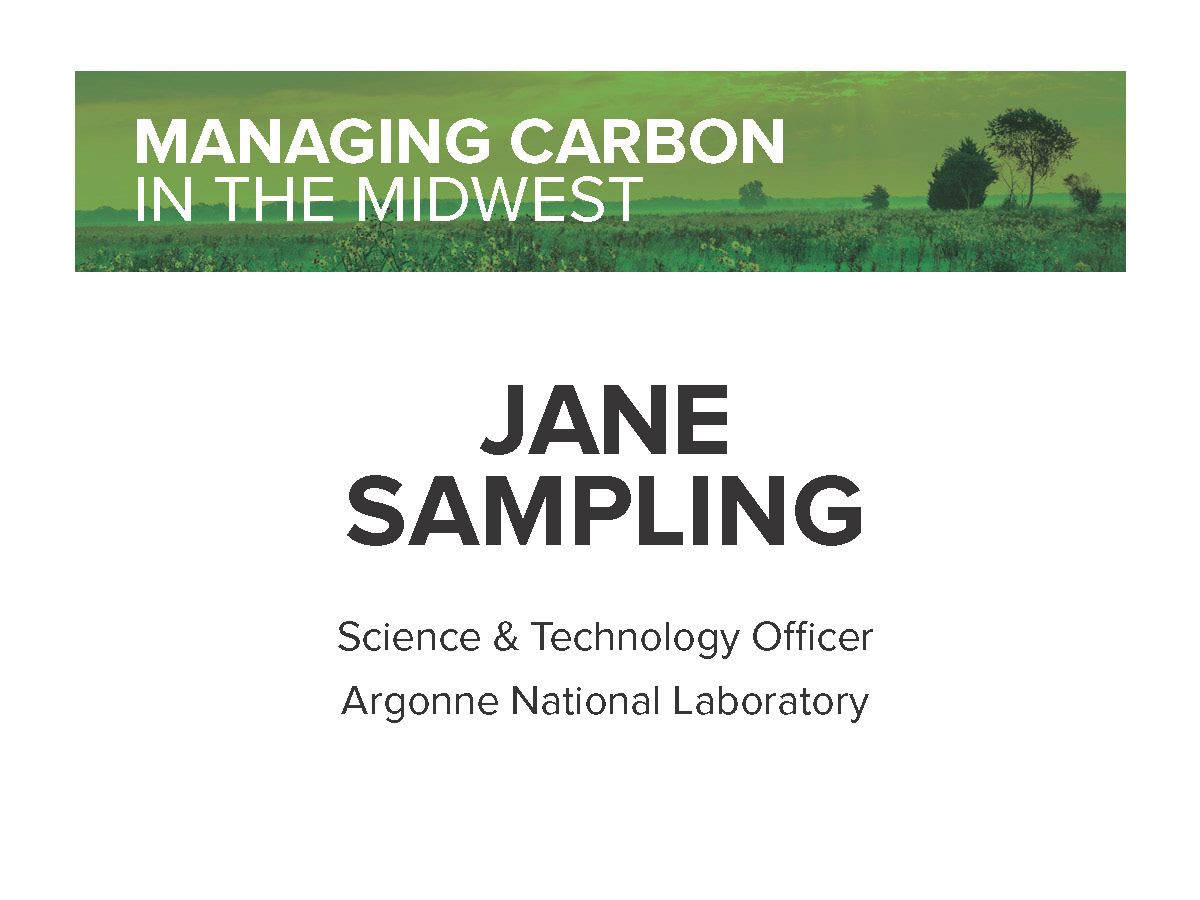 Various materials created for the Managing Carbon in the Midwest workshop including a pull-up banner, agenda, directional lawn signs, report cover, and name tag.