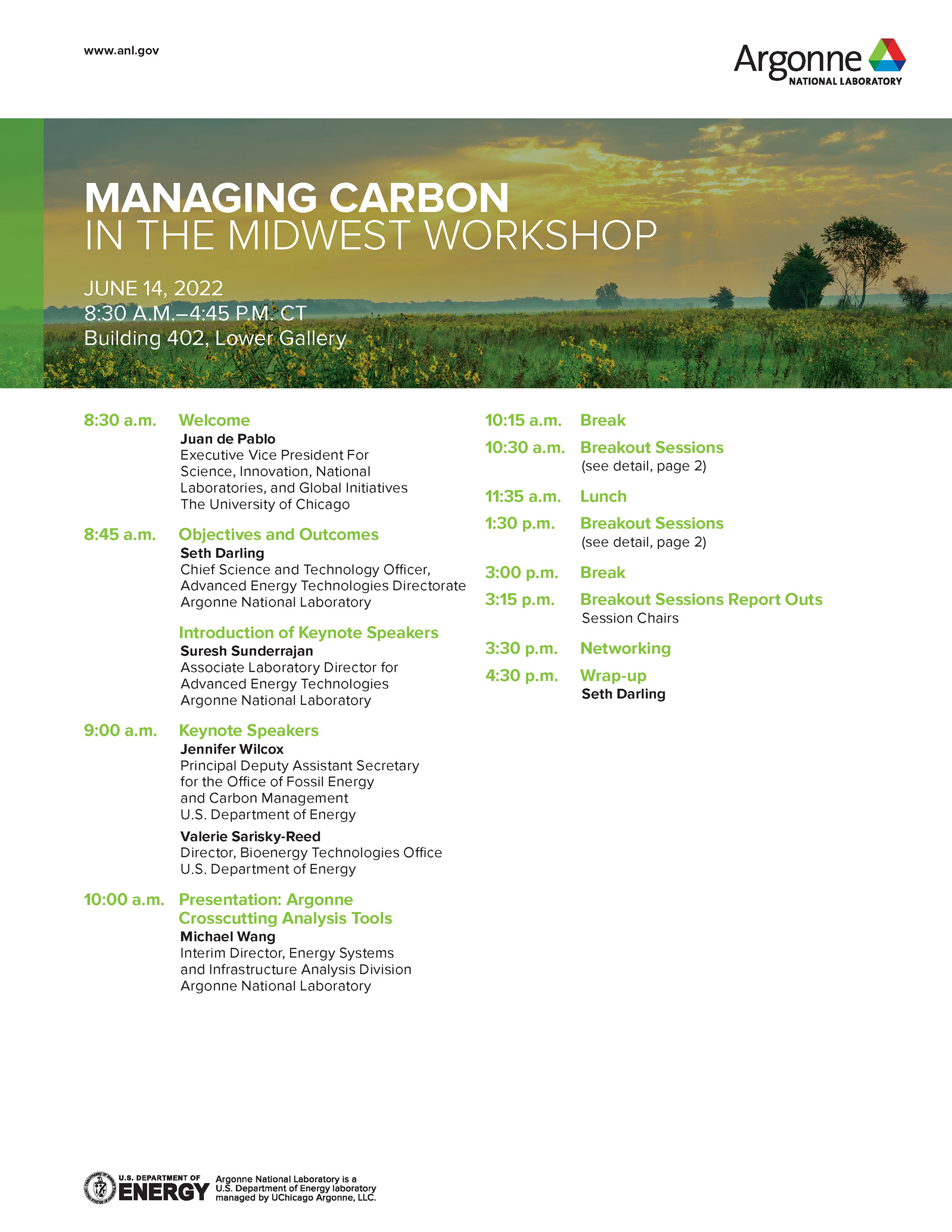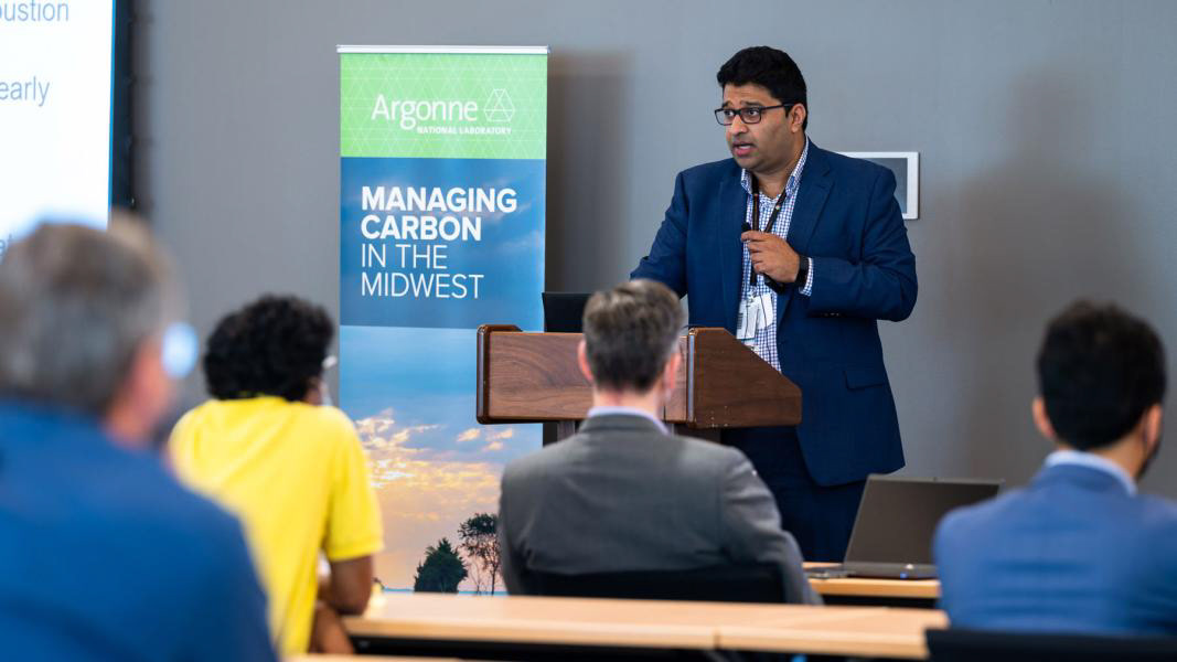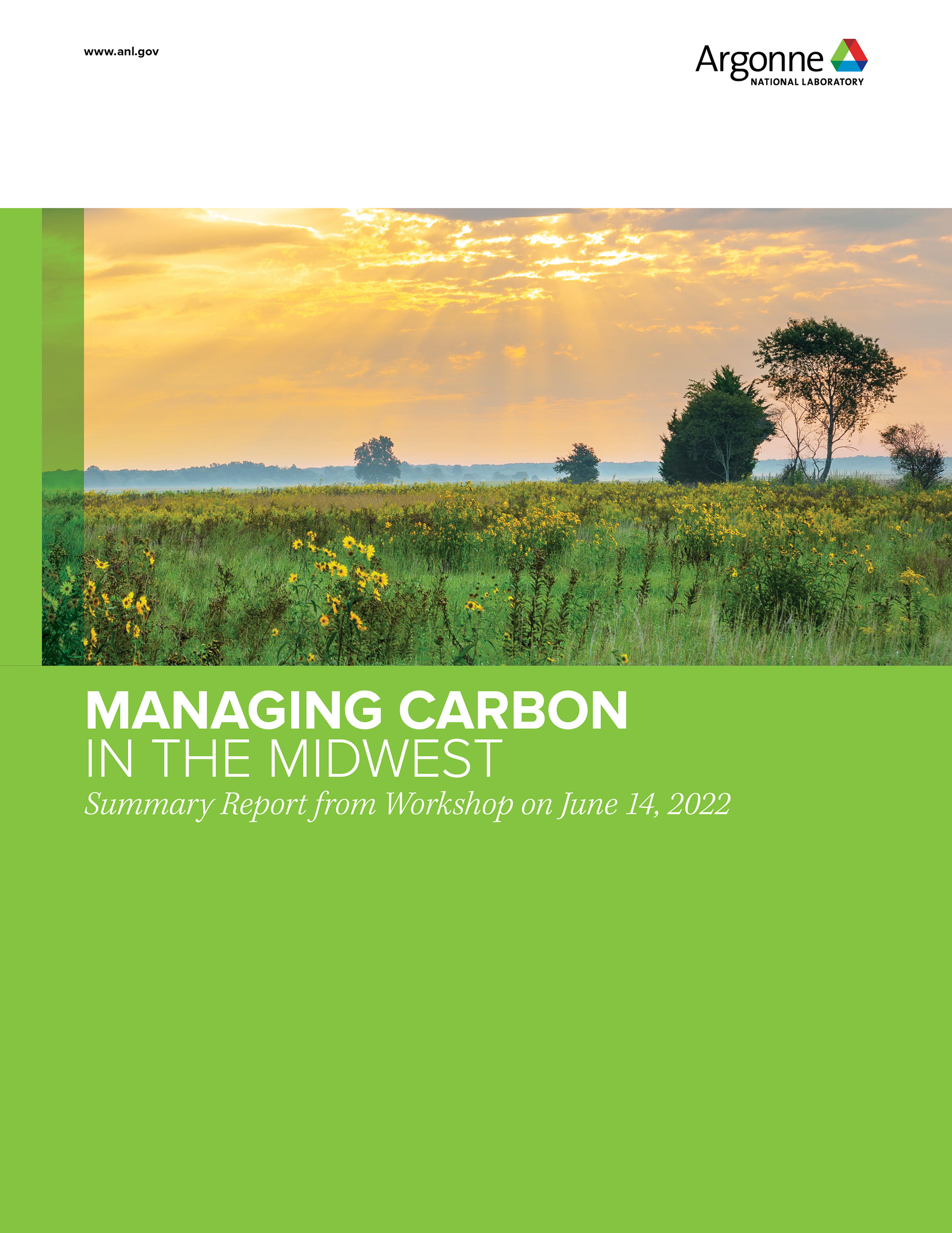 Various materials created for the Managing Carbon in the Midwest workshop including a pull-up banner, agenda, directional lawn signs, report cover, and name tag.